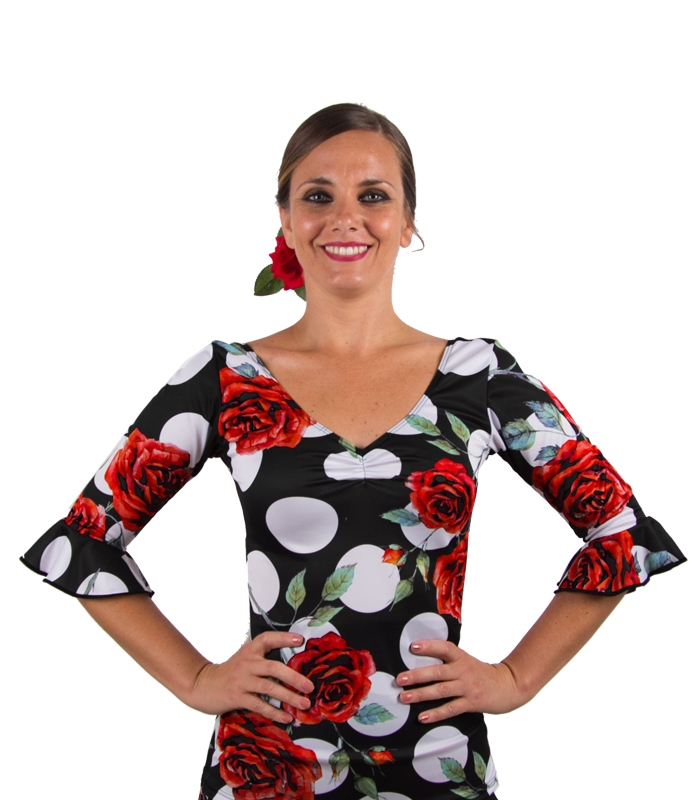 Flamenco Top designed with Red roses printed over white dots.